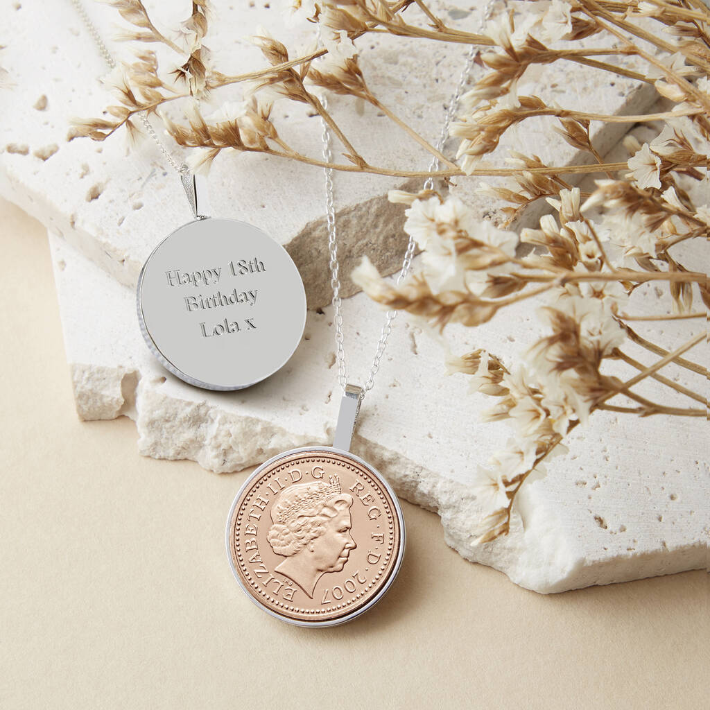An iconic gift to celebrate the big 18th birthday, celebrate in style with our unique penny necklace featuring a penny coin minted in their year of birth 2007.