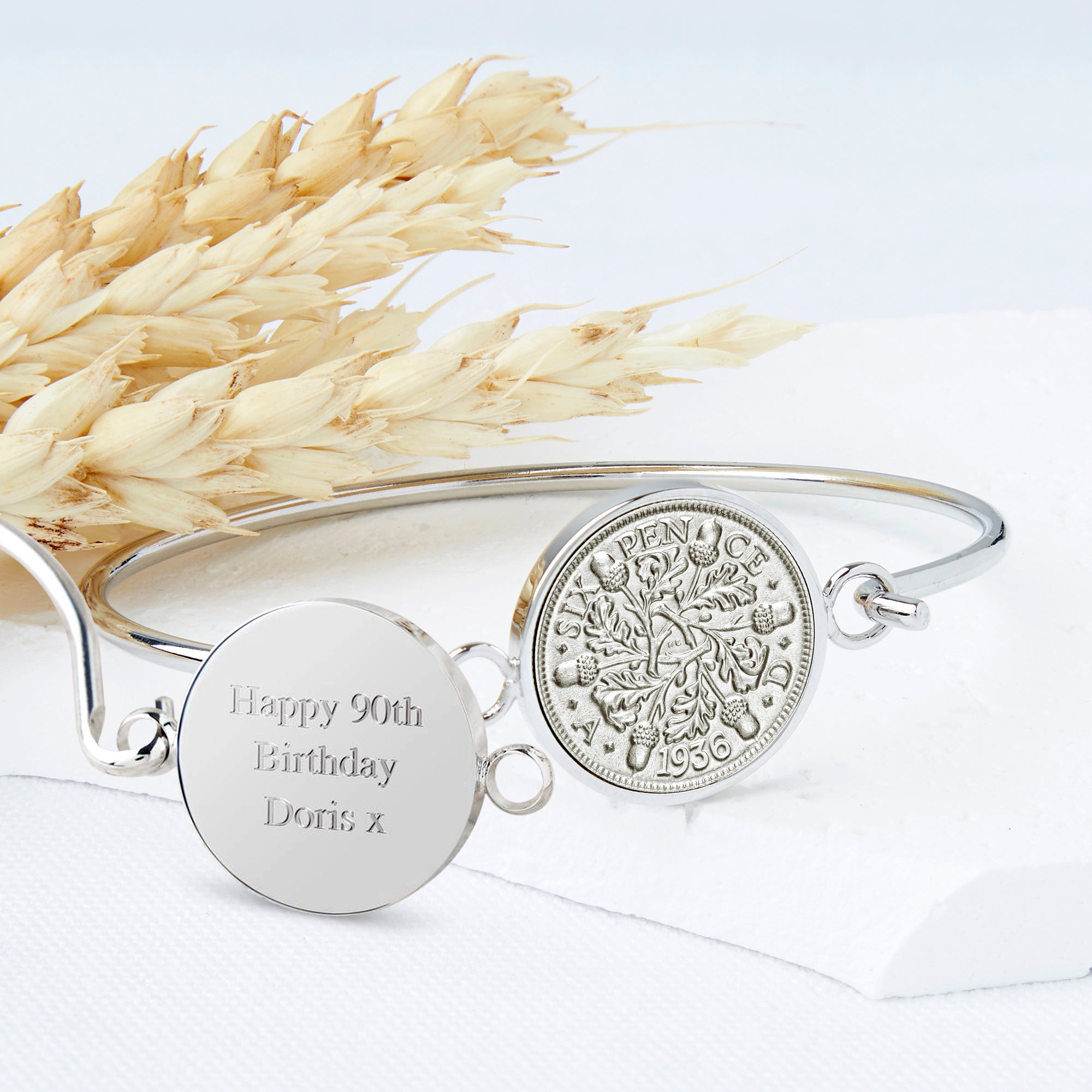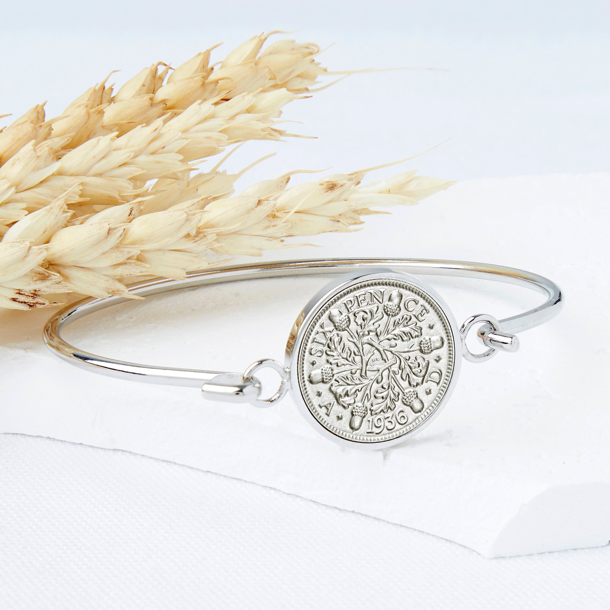 A beautiful bracelet made with a genuine 1936 sixpence coin on a silver plated bangle, the perfect gift 90th Birthday gift for her
