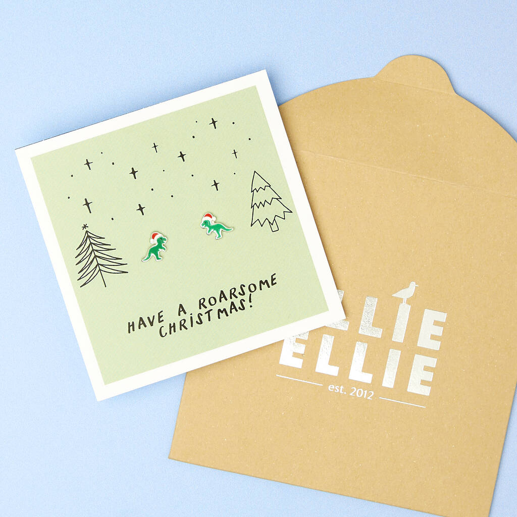Get into the festive spirit with these adorable festive dinasaur earrings. Made from sterling silver and a coourful epoxy coating they feature a tyrannosaurus with a fun Christmas hat, finished with a 'Have a Roarsome Christmas' backing card these earrings make a cute gift or a cheerful christmas treat for yourself.
